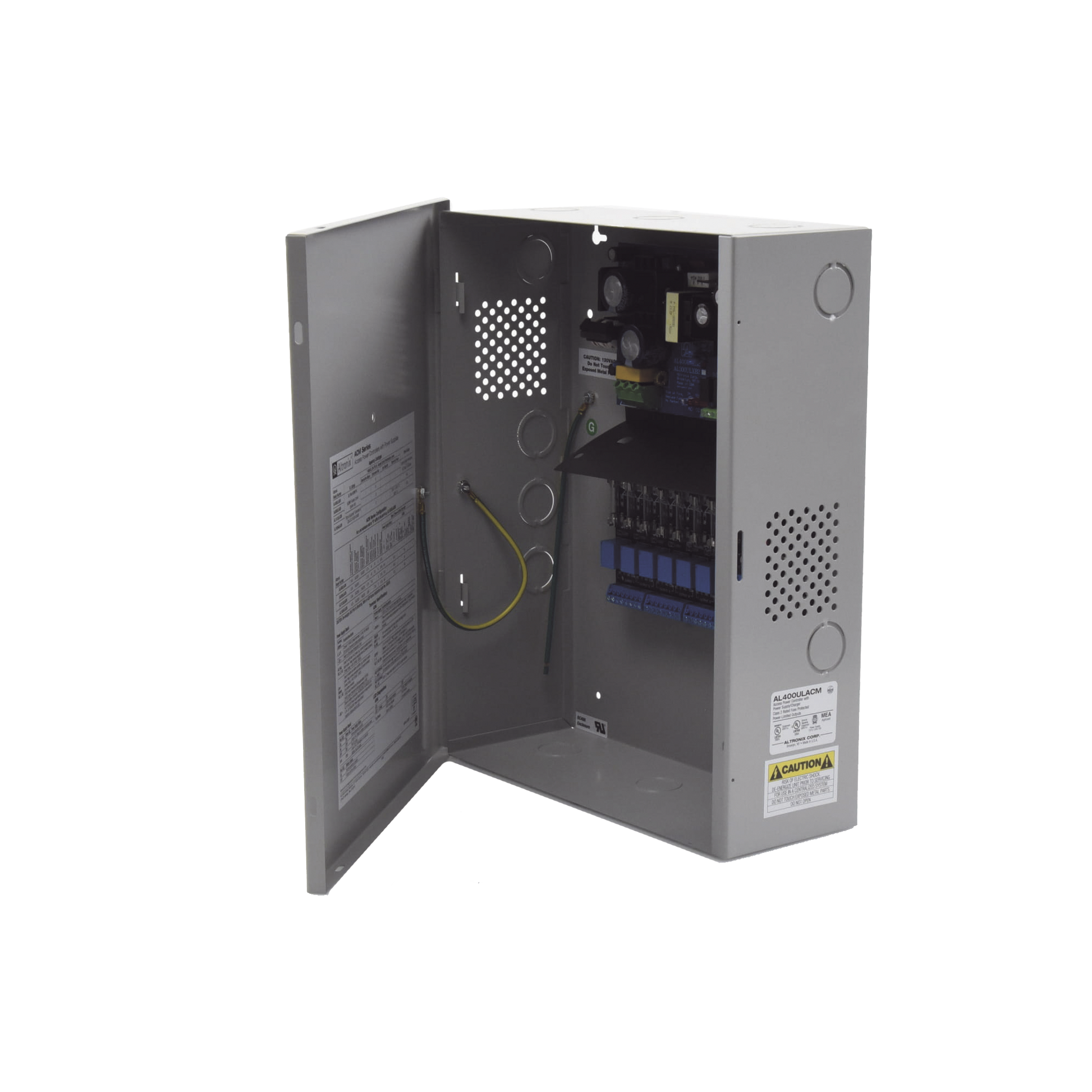 Fuente para aplicaciones en control de acceso, con capacidad de respaldo para 12 y 24 Vcc @ 4 A , con 8 circuitos de control ( NO ) y 8 circuitos de control trigger voltaje de entrada de : 115 Vca.