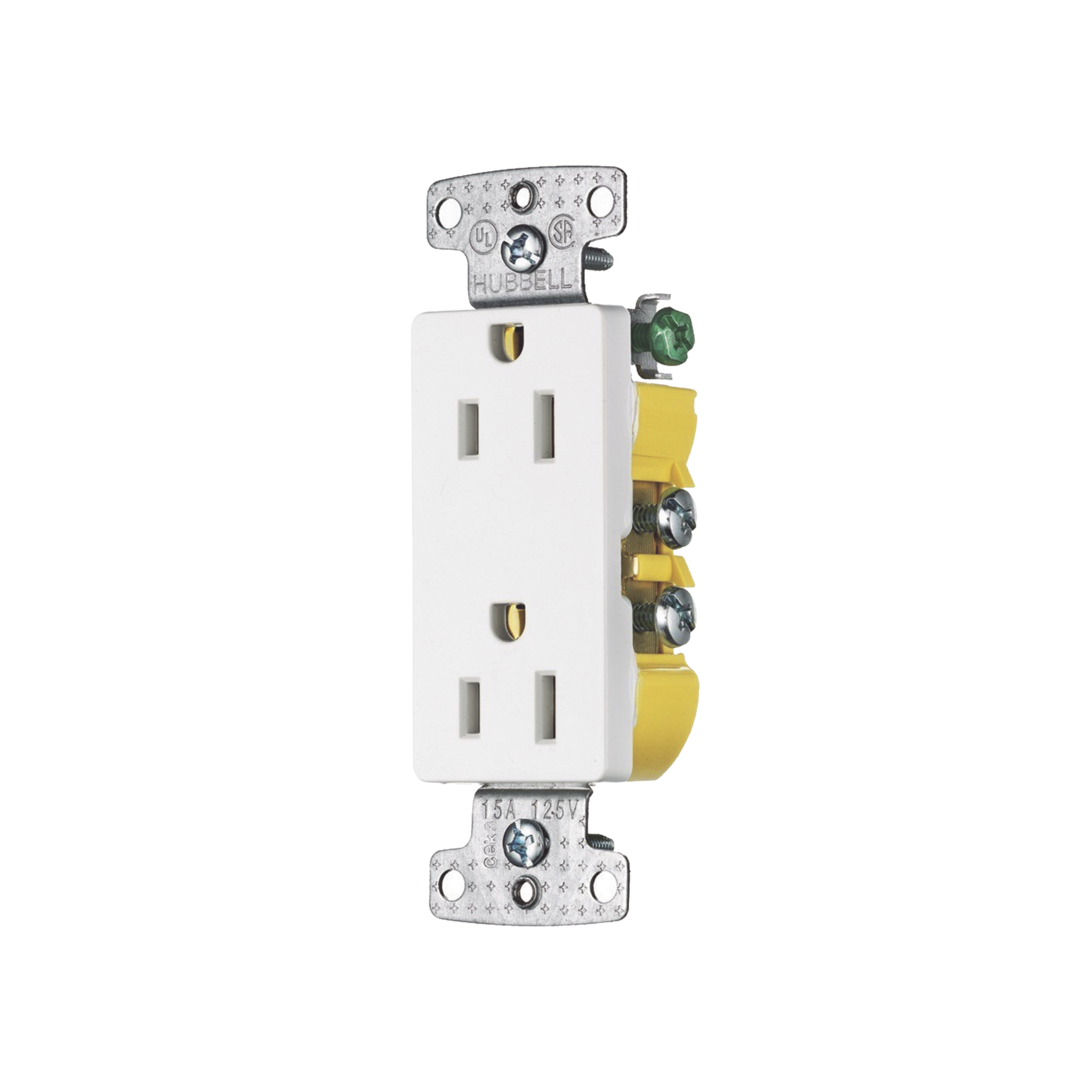 Dispositivos de hoja recta, receptáculo grado residencial, dúplex, decorador, 15A 125V, conexión a tierra de 2 polos y 3 cables, 5-15R, terminales de empuje, color blanco.