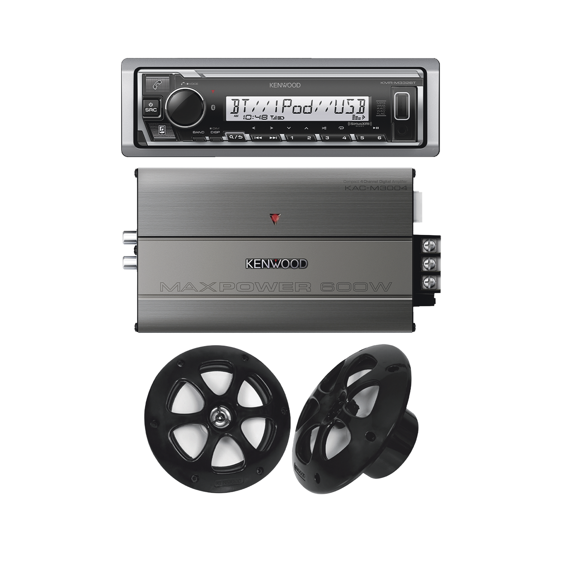 Kit de estereo con Bluetooth KMR-M332BT | Amplificador KAC-M3004 | mas Par de bocinas KFC-1613MRB