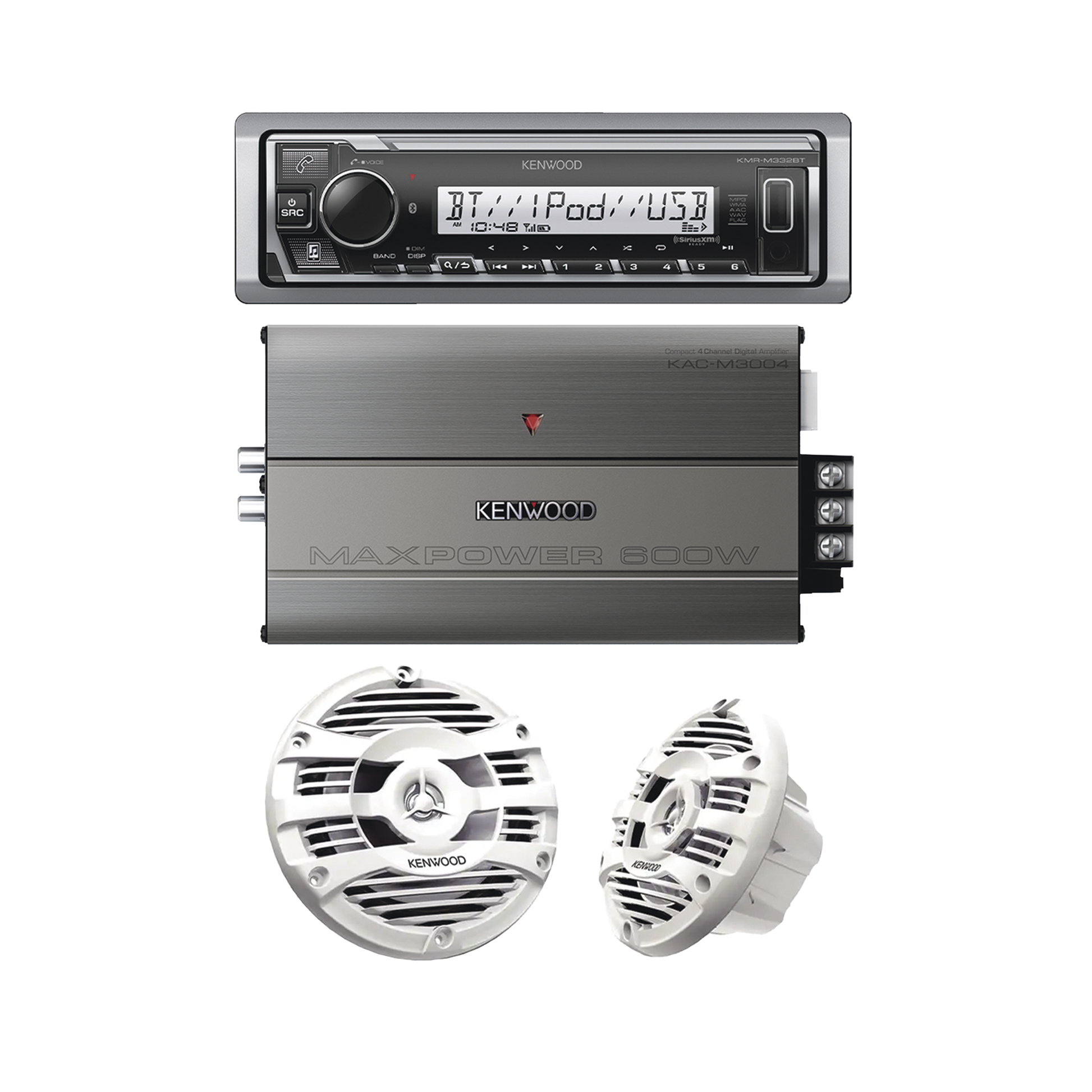 Kit de estéreo con Bluetooth KMR-M332BT | Amplificador KAC-M3004 | más Par de bocinas KFC-1653MRW