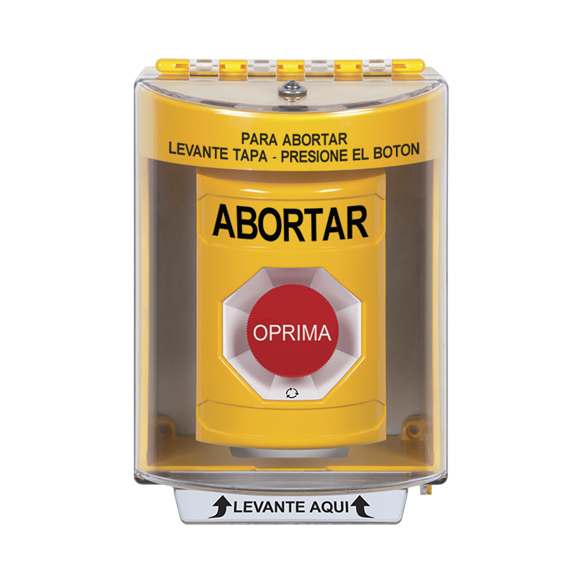 Botón de Abortar, Texto en Español, Tapa Protectora de Policarbonato Súper Resistente, Girar para restablecer