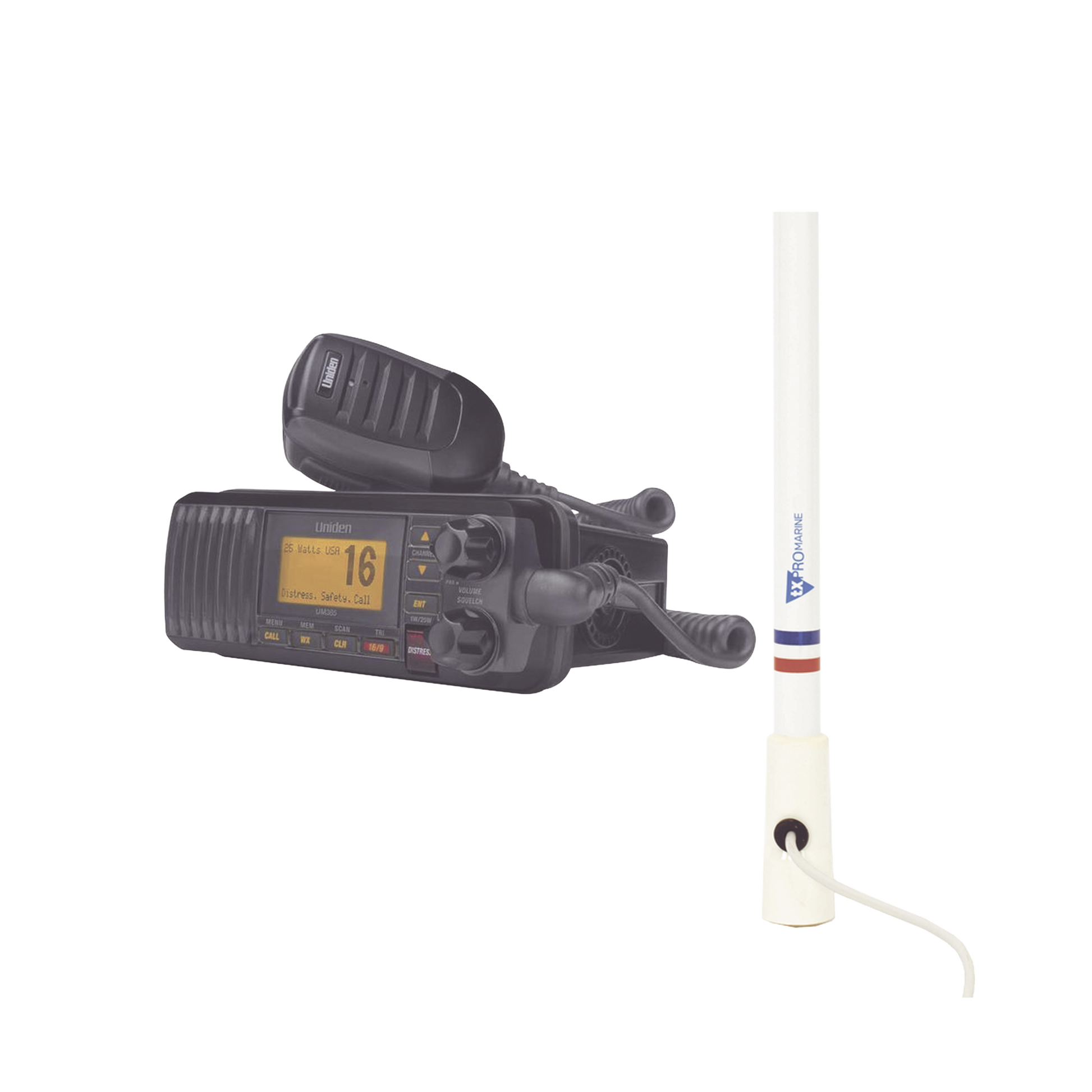Kit de radio UM385BK | mas antena marina de fibra de vidrio TX-5206-SYS y soporte para antena 4186